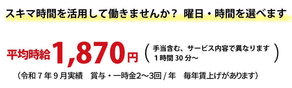 時間給 | ・登録制ケアスタッフ 1,550 ~ 2,000 平均時給1,750円(2024年11月分実績) (生活 ~身体1時間あたりに換算) (処遇改善手当含む) |
